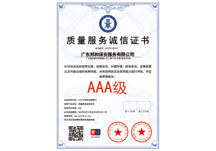 AAA级质量服务诚信证书